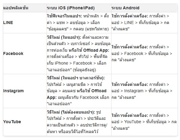 ตารางสรุปวิธีลบไฟล์ขยะ (Cache) ฉบับอัปเดต 2025