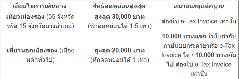 *สรุป ถ้าต้องการรับ สิทธิ์ลดหย่อนภาษีสูงสุด 30,000 บาท ต้องเลือกเที่ยวในเมืองรอง โดยค่าใช้จ่าย 10,000 บาทแรก จะถูกนำไป หักลดหย่อนได้ถึง 15,000 บาท และส่วนที่เหลืออีก 15,000 บาท (จากค่าใช้จ่ายจริง 10,000 บาท) จะเป็นส่วนของ e-Tax Invoice ทั้งหมด รวมค่าใช้จ่ายจริงไม่เกิน 20,000 บาท แต่ได้ลดหย่อนสูงสุด 30,000 บาท (หากเลือกเมืองรองตลอดทริป) ดังนั้น การขอ e-Tax Invoice จึงสำคัญที่สุด!