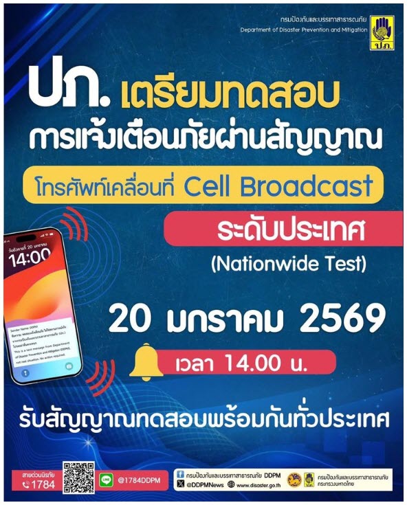 กรมป้องกันและบรรเทาสาธารณภัย (ปภ.) ประกาศผู้ใช้งานมือถือทั้งประเทศว่าจะมีการทดสอบระบบแจ้งเตือนภัยผ่านโทรศัพท์เคลื่อนที่ (Cell Broadcast Service) ครั้งใหญ่ระดับประเทศ เพื่อทดสอบความพร้อมในการส่งสัญญาณเตือนภัยฉุกเฉินสู่ประชาชน ในวันจันทร์ที่ 20 มกราคม 2569 เวลา 14:00 น. โดยจะทดสอบ ระบบสัญญาณพร้อมกัน ทั่วประเทศ (76 จังหวัด และกรุงเทพมหานคร)