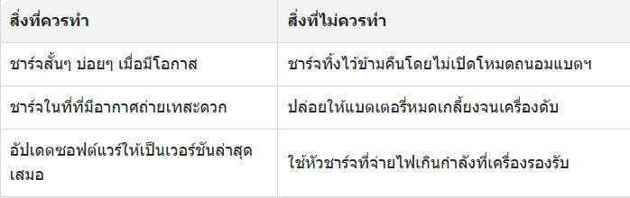 • การจำกัดการชาร์จไว้ที่ 80% ตลอดเวลา หรือบางเครื่องสามารถตั้งได้ก็ลองปรับดูที่เหมาะสม