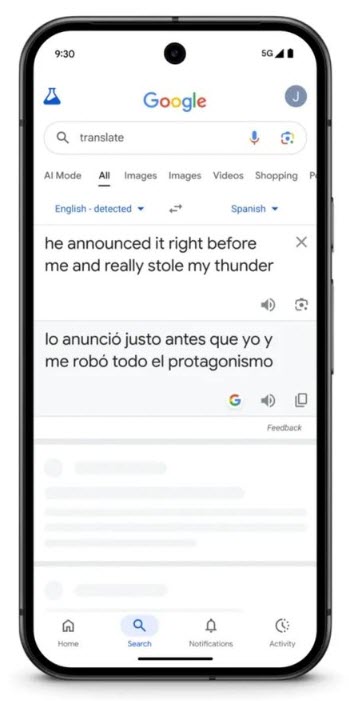 หมดปัญหาแปลแล้วงง! ด้วยความฉลาดของ Gemini ต่อไปนี้เวลาเราค้นหาคำแปลของสำนวน (Idioms), ภาษาถิ่น หรือคำสแลงใน Google Search ระบบจะไม่แปลแบบ "คำต่อคำ" อีกต่อไป แต่จะวิเคราะห์บริบทเพื่อให้ความหมายที่แท้จริง ตัวอย่างเช่น ถ้าค้นหาคำว่า "stealing my thunder" AI จะไม่งง แต่จะแปลความหมายจริงๆ ว่า "ถูกแย่งซีน" หรือ "ถูกขโมยความดีความชอบ" ให้ทันที ช่วยให้เราเข้าใจและนำไปใช้ต่อได้ถูกต้อง