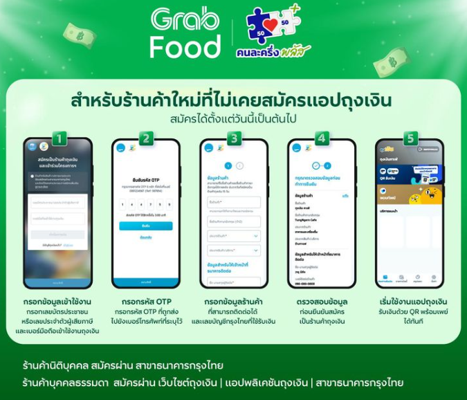 3 พฤศจิกายน - 19 ธันวาคม 2568 เลือกเข้าร่วมฟู้ดเดลิเวอรี่กับ GrabFood ผ่านแอปฯ ถุงเงิน และรอรับสิทธิประโยชน์พิเศษจาก Grab ร้านค้าใหม่และร้านค้าเดิมที่ต้องการเข้าร่วมฟู้ดเดลิเวอรี่