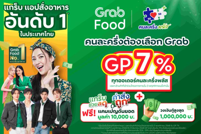 7 พฤศจิกายน - 31 ธันวาคม 2568 เริ่มต้นรับออเดอร์ จากผู้ใช้งาน Grab นับล้านคนที่ใช้สิทธิ์ 'คนละครึ่งพลัส' สั่งอาหารออนไลน์บนแอป Grab ร้านค้าที่สมัครสำเร็จ