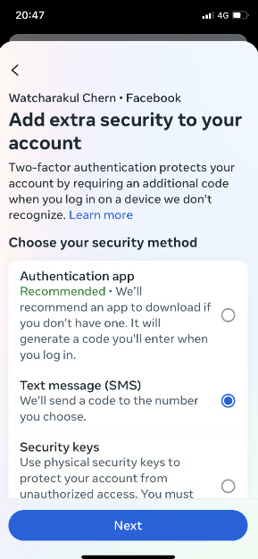 ในหน้าแจ้งเตือนของแอป Facebook จะมีขั้นตอนการดำเนินการต่อ เราจะต้องเปิด Two-Factor Authentication รวมถึงต้องยืนยันตัวตนด้วย