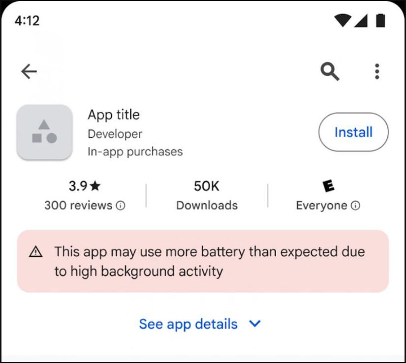 แสดงคำเตือนบนหน้าร้าน: Google อาจแสดงคำเตือนบนหน้าดาวน์โหลดของแอปนั้นๆ เพื่อแจ้งให้ผู้ใช้ทราบว่า "แอปนี้อาจใช้แบตเตอรี่ของคุณเร็วกว่าปกติ"