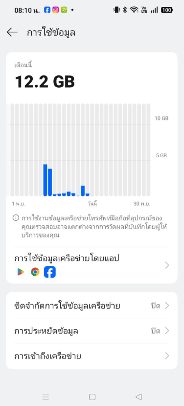 Android: ไปที่ Settings (ตั้งค่า) > Network & internet (เครือข่ายและอินเทอร์เน็ต) > Data usage (การใช้ข้อมูล)