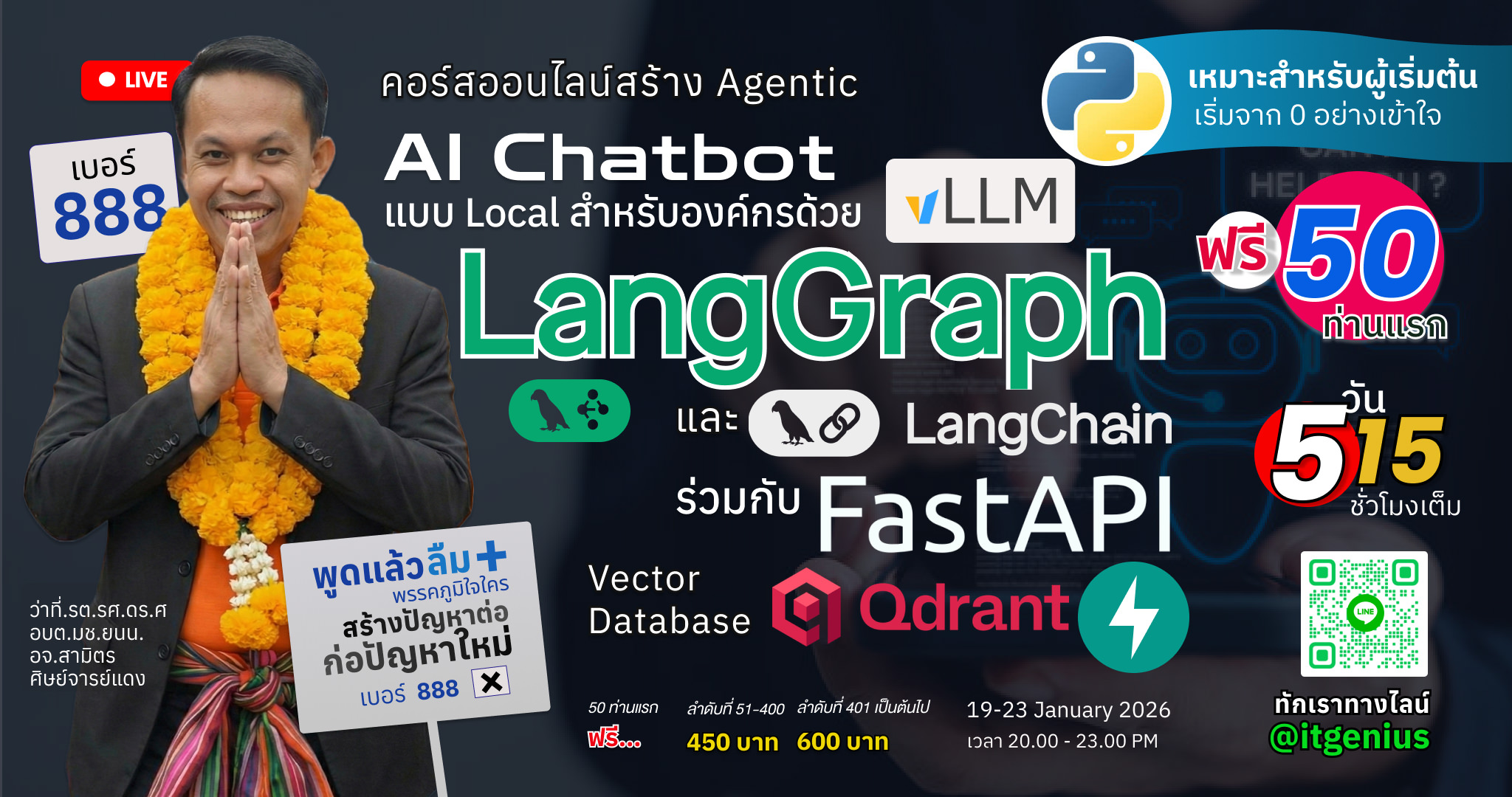 ***หมายเหตุ หลักสูตรนี้เน้นการใช้งาน LangChain และ LangGraph ร่วมกับ Python เพื่อสร้าง AI Chatbot ที่ทำงานได้ภายในองค์กรอย่างปลอดภัยและมีประสิทธิภาพ โดยใช้ Ollama, vLLM และ Qdrant เป็นเทคโนโลยีหลัก ผู้เรียนไม่จำเป็นต้องมีคอมพิวเตอร์ที่มี GPU สูงมากก็สามารถเรียนได้