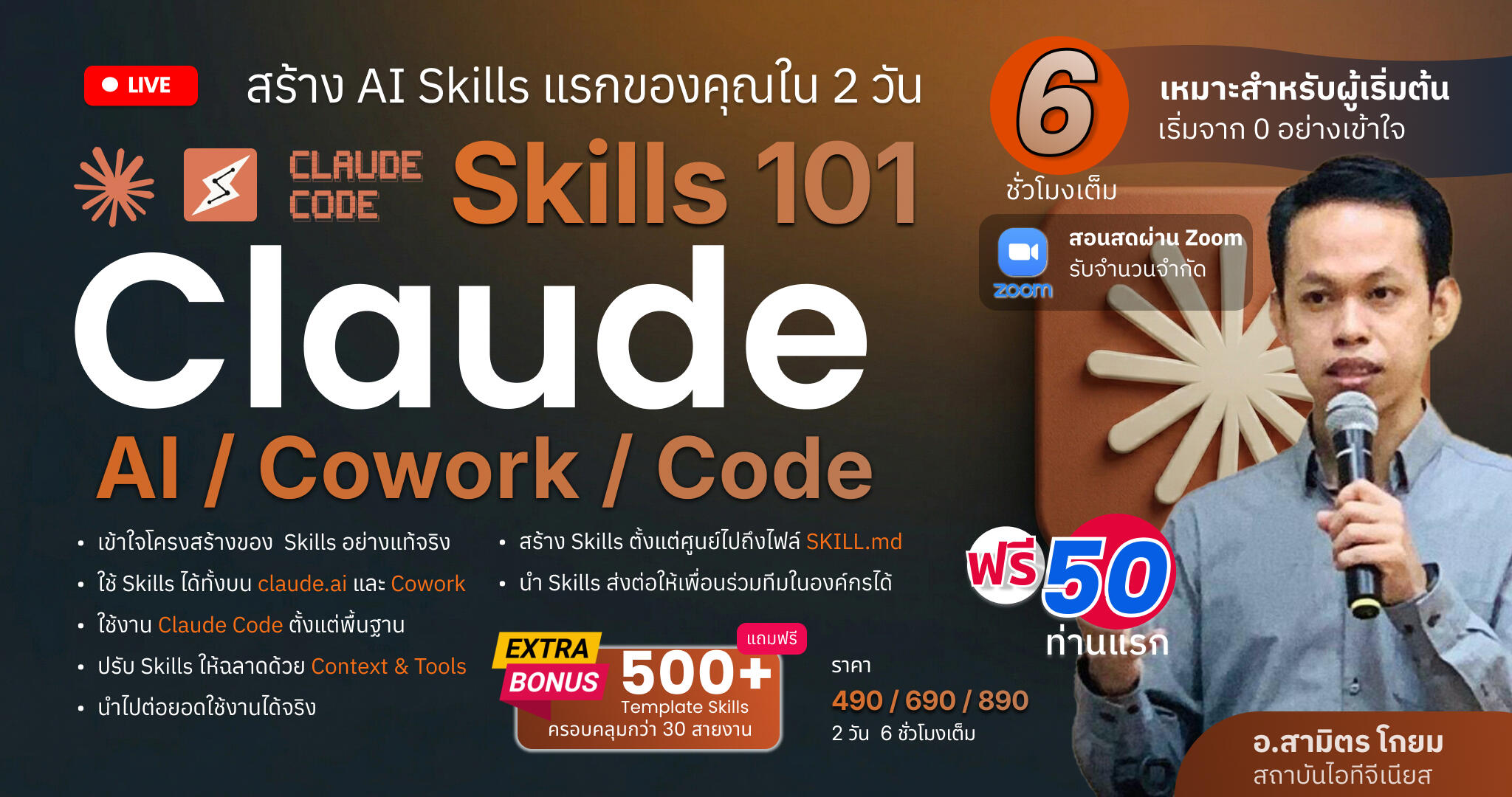 *** หมายเหตุ หลักสูตรนี้เน้นการลงมือปฏิบัติจริงผ่าน Workshop ตลอด 2 คืน ผู้เรียนจะได้สร้าง Skill จริงตั้งแต่ศูนย์ ทดสอบ ปรับปรุง และนำไปใช้งานได้ทันทีหลังจบการอบรม โดยแบ่งเป็นวันที่ 1: Claude & Cowork และวันที่ 2: Claude Code